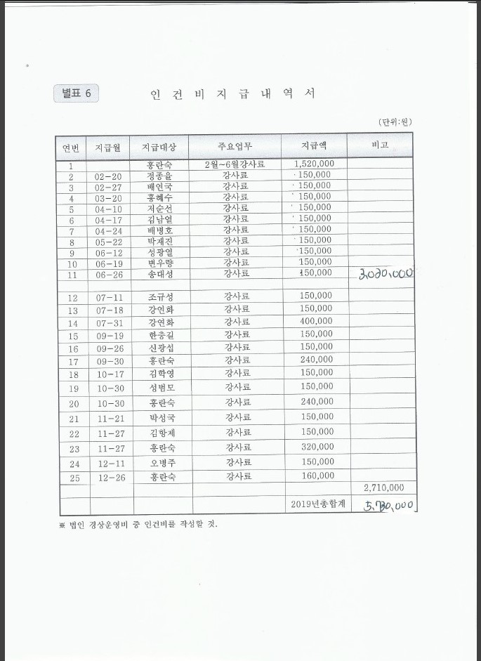2019년1.1.~12.31 인건비 강사료 지급명세